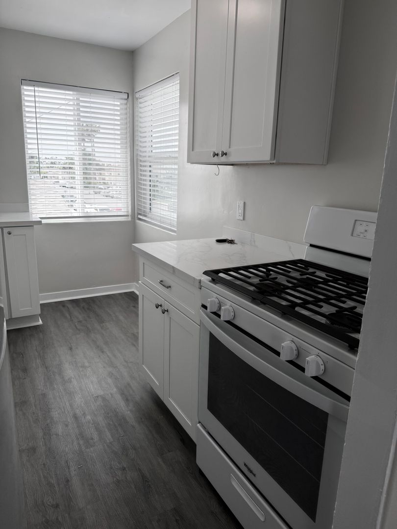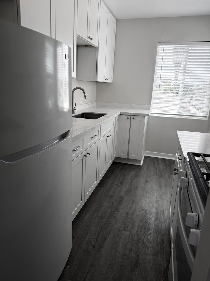 2 bedroom 1 bath upper end unit with one car garage and one space. New flooring , remodeled kitchen with quartz countertops.